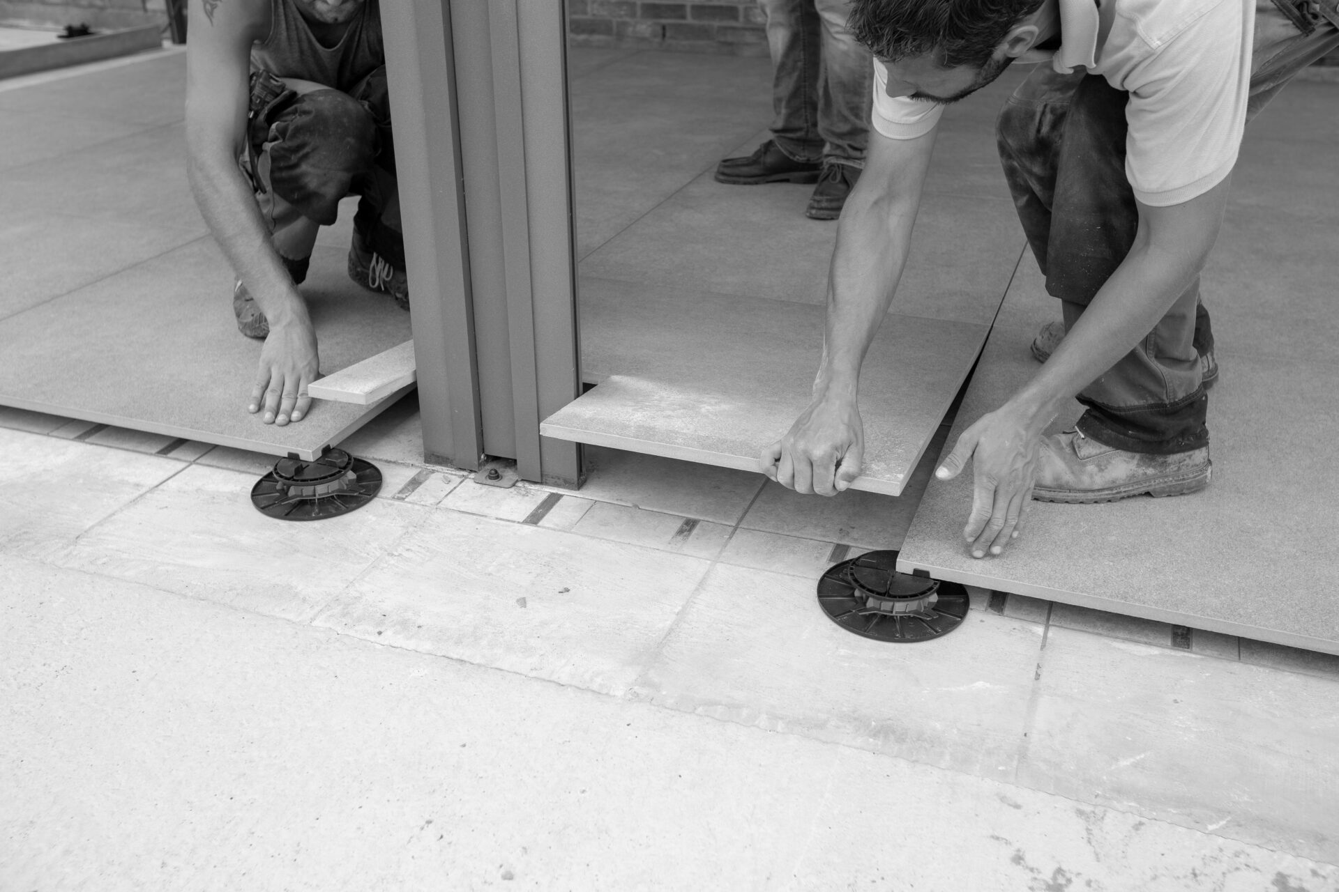 - Pour une terrasse en dalles : Prévoir 4 plots par dalle standard (60 x 60 cm) ou ajouter un cinquième plot au centre pour les dalles plus fragiles.